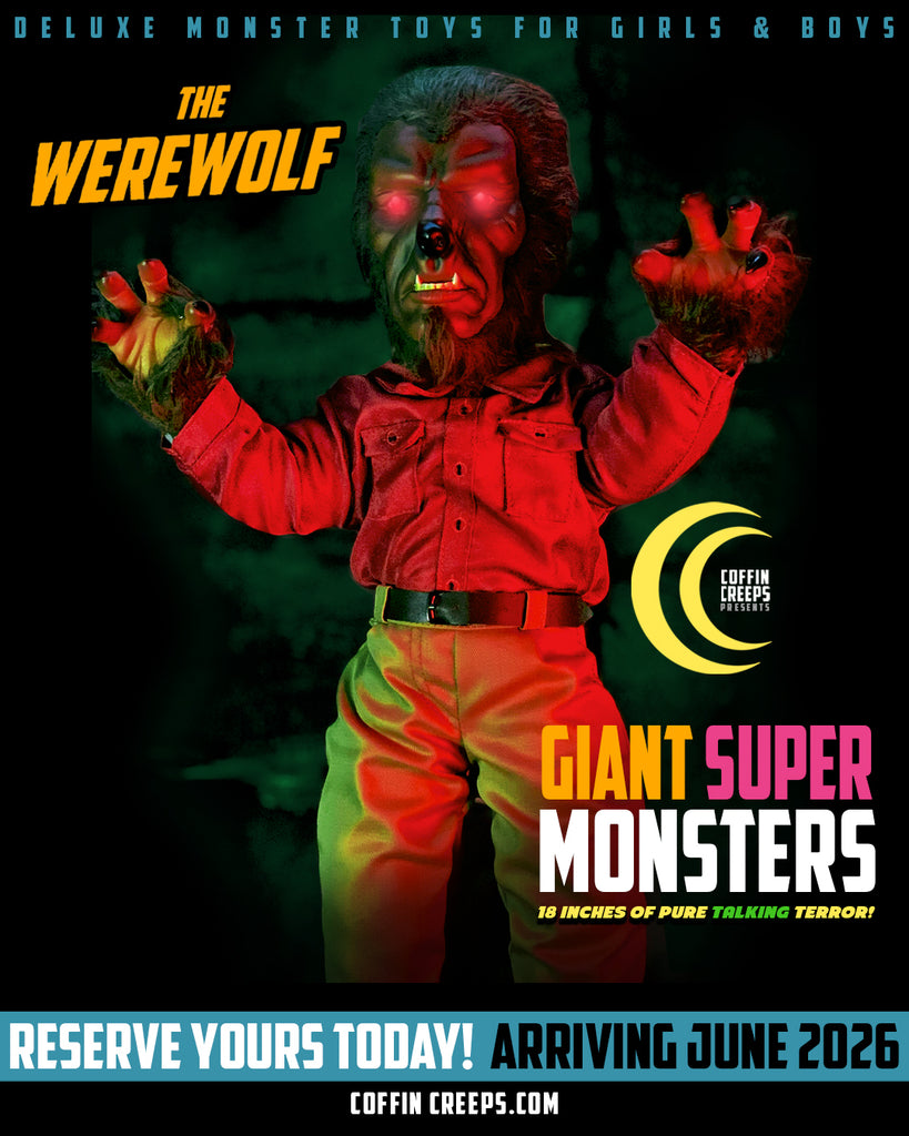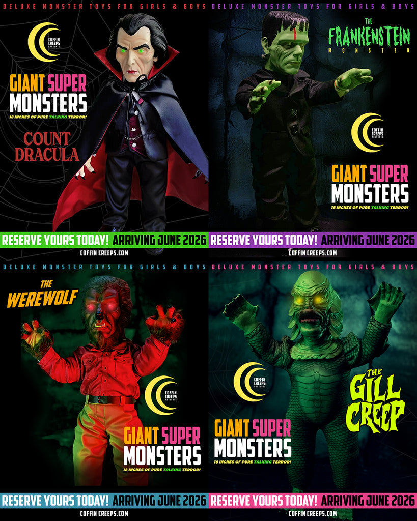 There will be only 100 of these limited edition box sets assembled containing the new versions of all 4 Color Coffin Creeps 18 Inch / Talking - Giant Super Monsters: The Frankenstein Monster, Count Dracula, The Gill Creep, and The Werewolf.