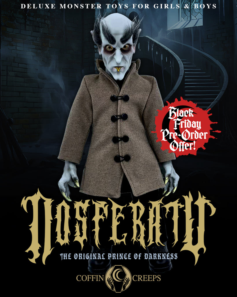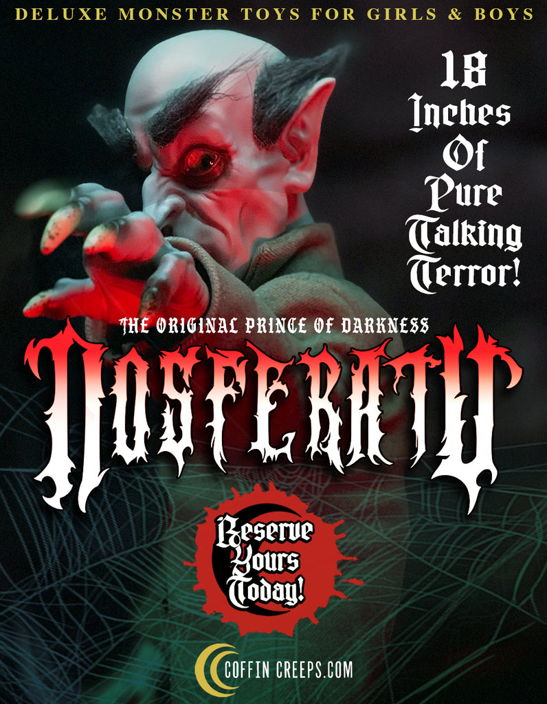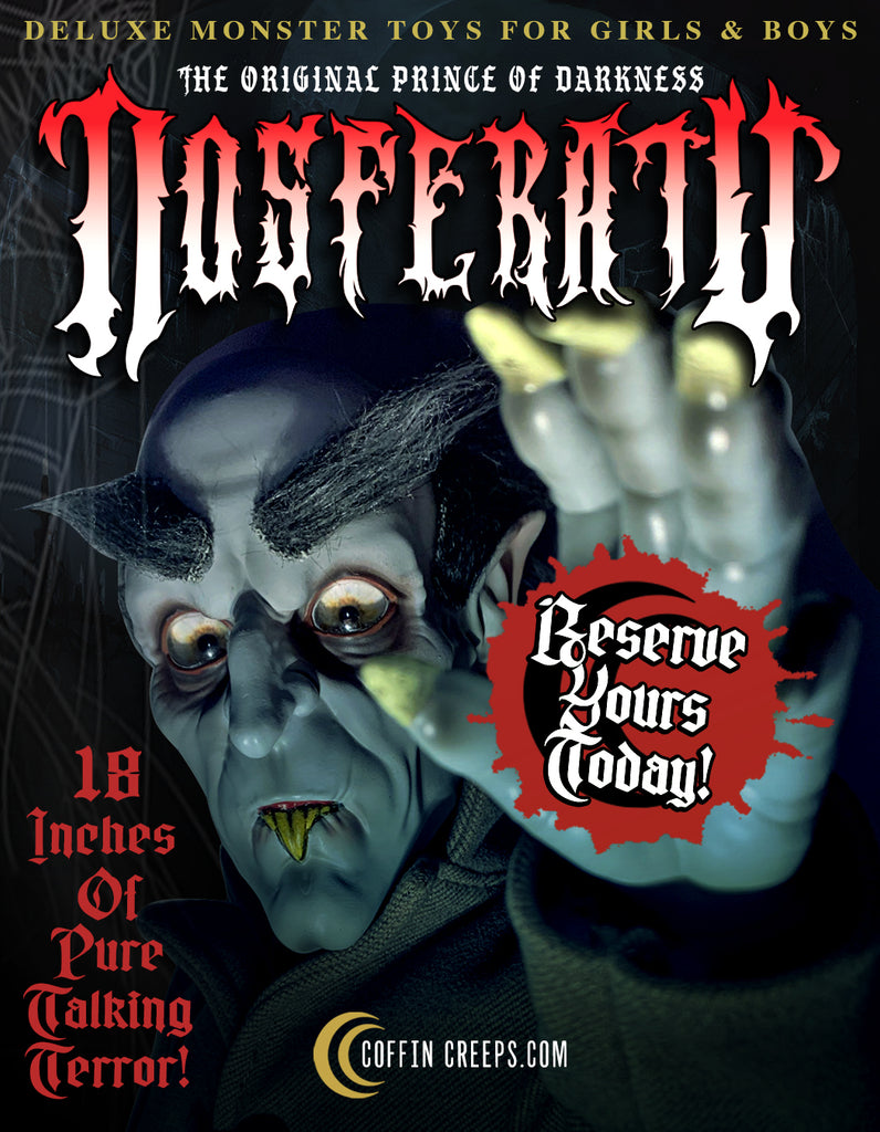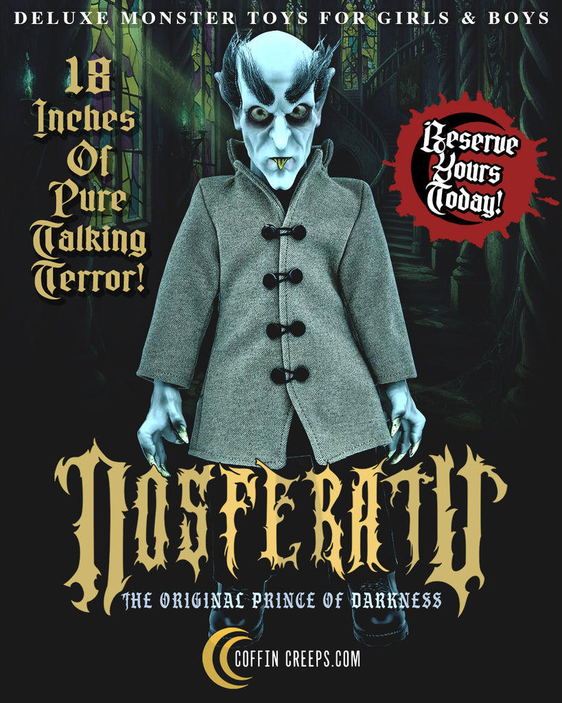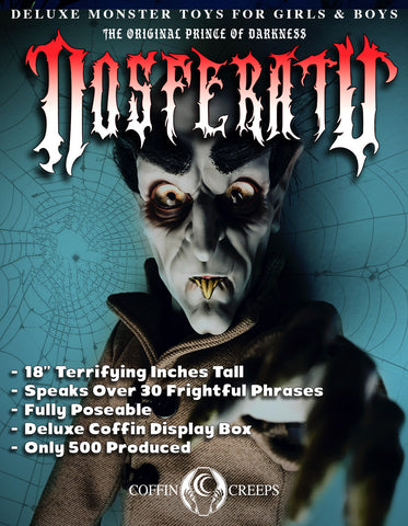 Unearthed from the shadows… Coffin Creeps presents the ultimate Nosferatu collectible. Fully posable at an imposing 18 inches tall, with hair-raising eyes that follow you, realistic tailored clothing, and high-detail sculpted head, hands, and feet. He speaks 40+ terrifying phrases and arrives entombed in a premium collector’s display coffin. Pre-order now at a shockingly low price before he rises to his full value! Only 500 Produced!